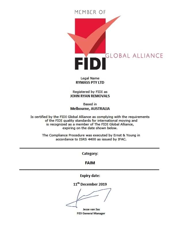 John Ryan Removals has been certified by the FIDI Global Alliance as complying with the requirements of the FIDI quality standards for international moving and is recognized as a member of The FIDI Global Alliance. Jesse Van Sas, General Manager of FIDI writes: 'It is with great pleasure that we note your performance on the FAIM 3.1 Compliance Procedure as verified by Ernst & Young and would hereby like to award you the FAIM 3.1 certificate. The quality assessment you have just undergone is the toughest and most strenuous in the industry and we commend you on your results'.